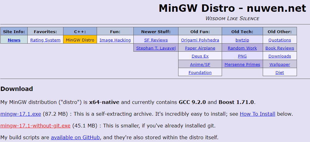 News - nuwen.net So high, so low, so many things to know News 12/11/2019 - Version 17.1 of my MinGW Distro is available. 11/27/2019 - Version 17.0 of my MinGW Distro is available. 12/30/2018 - Version 16.1 of my MinGW Distro is available. 7/4/2018 - Versio