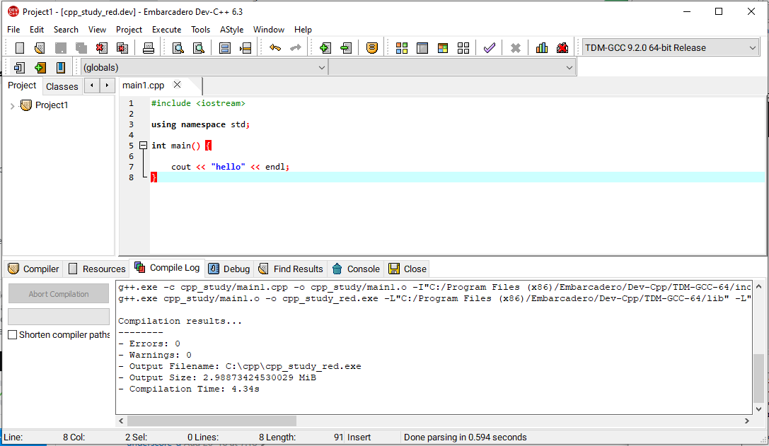 저는 상대적으로 매우 가벼운 툴인 Dev C++ 를 사용합니다. 빠르고, 간편하고, 무료인 C/C++ 에디터 입니다. 해당 버전은 TDM-GCC 9.2.0 64-bit Release를 포함하고 있어 최상위 버전을 지원합니다.