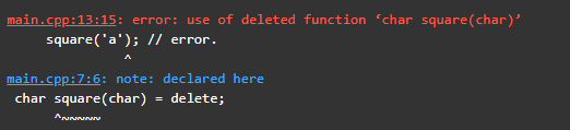 그래서 char형을 받아 처리해 주는 char square(char) 함수를 삭제 해주면, squre('a'); 를 처리해주지 않고 에러가 발생합니다.
