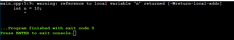 main.cpp:5:9: warning: reference to local variable ‘n’ returned [-Wreturn-local-addr]