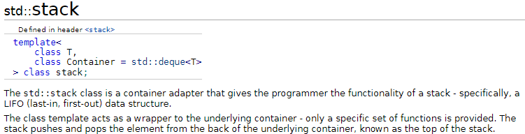 template< class T, class Container = std::deque > class stack; The std::stack class is a container adapter that gives the programmer the functionality of a stack - specifically, a LIFO (last-in, first-out) data structure. The class template act
