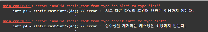 int* p3 = static_cast<int*>(&d); // error : 서로 다른 타입의 포인터 변환은 허용하지 않는다.