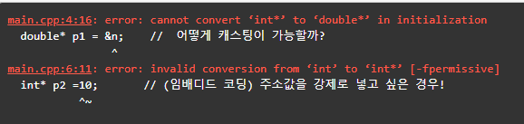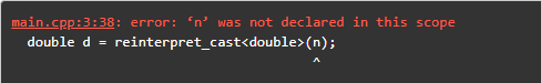 정수 n을 d로 변경하기 위해 reinterpret_cast를 사용하면 아래와 같은 에러가 발생한다. 위에 제시된 두 가지 용도 이외로 사용이 불가하다.