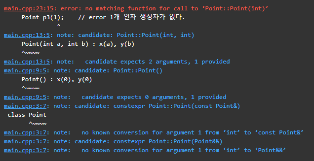 Point p3(1); 의 경우 아래와 같이 인자 한개짜리 생성자가 없다고 에러를 보여준다.