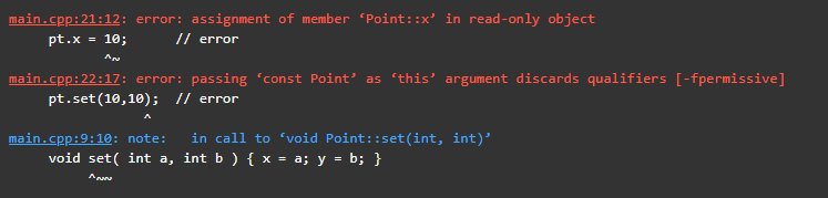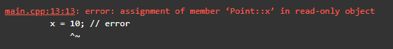 main.cpp:13:13: error: assignment of member ‘Point::x’ in read-only object