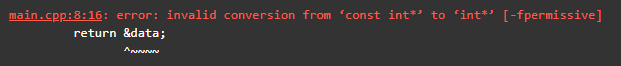 아래 코드는 문제 없어 보이지만 에러가 발생한다. 리턴하는 타입이 const int*인데 getData() 앞에 선언된 리턴 타입은 int*로 되어 있기 때문에 conversion 에러가 발생한다.