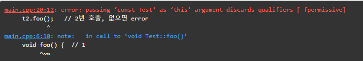 cosnt Test t2 객체를 생성해 foo()를 호출하면 2번 foo()가 호출된다.
