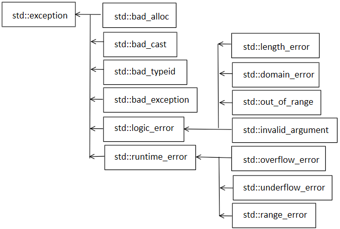 - 이미 C++표준 예외 클래스가 정의되어 있고 이를 사용하는 것이 좋다.