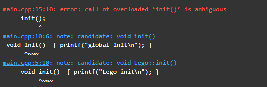 명시적으로 선언을 해주면 해결된다. Lego:: 를 붙여주어 Lego init을 호출하거나 :: 를 붙여 global이 호출되도록 할 수 있다.